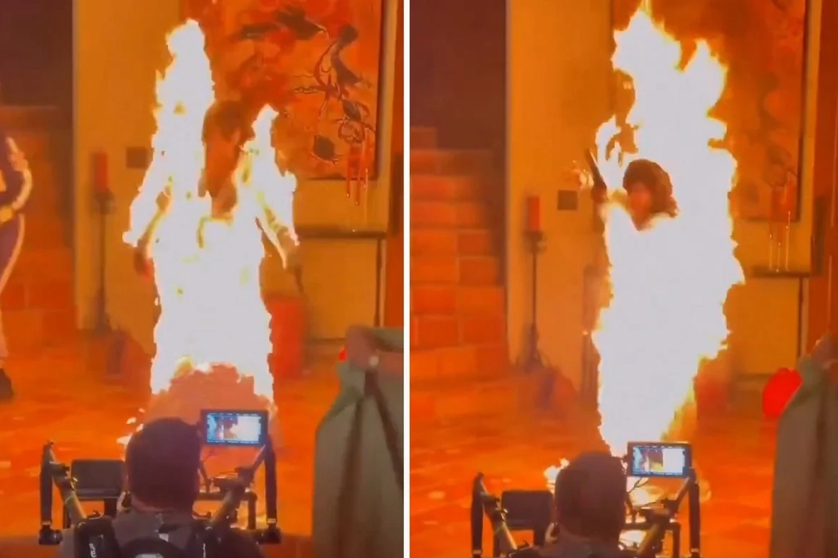 Senaryo gereği kullanılan alevlerin bir anda kontrolden çıkması üzerine ünlü yıldızın kıyafeti tutuştu. Set ekibi yangına söndürme tüpleriyle anında müdahale etti.