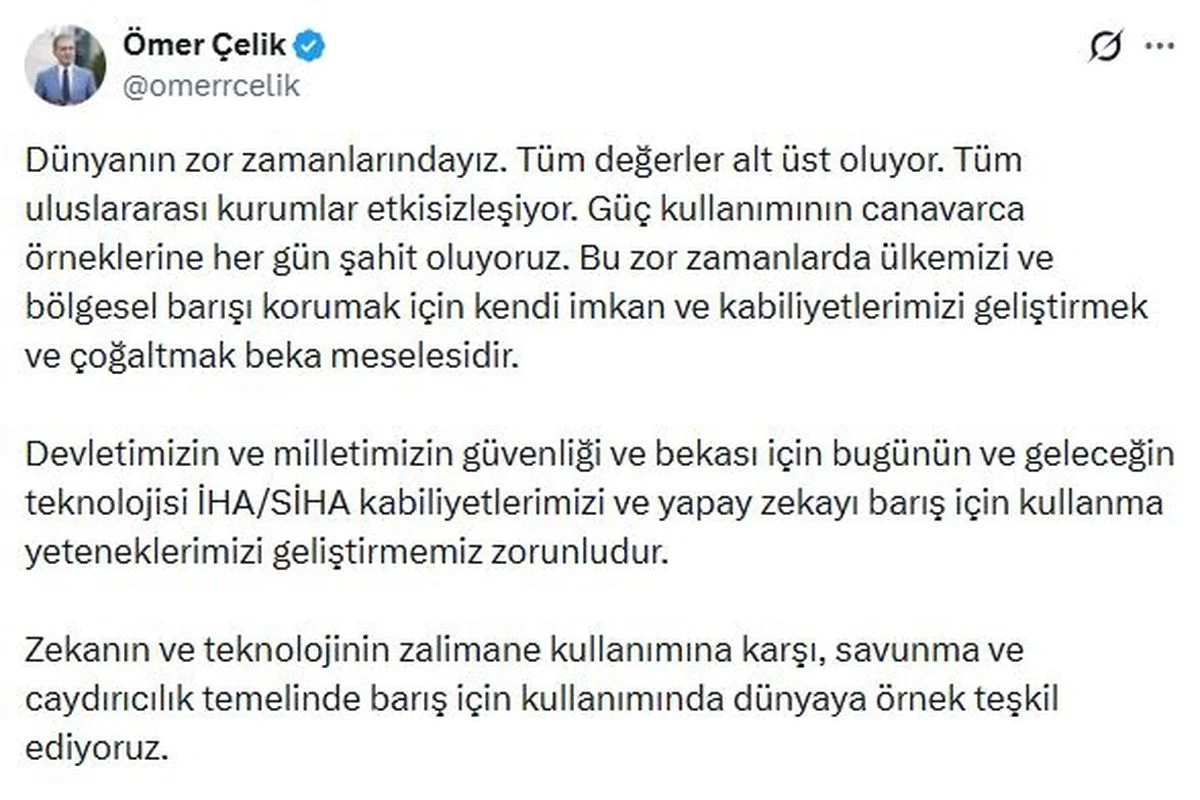 Ak Parti Genel Başkan Yardımcısı ve Parti Sözcüsü Ömer Çelik, "Devletimizin ve milletimizin güvenliği ve bekası için bugünün ve geleceğin teknolojisi İHA/ Siha kabiliyetlerimizi ve yapay zekayı barış için kullanma yeteneklerimizi geliştirmemiz zorunludur. Zekanın ve teknolojinin zalimane kullanımına karşı, savunma ve caydırıcılık temelinde barış için kullanımında dünyaya örnek teşkil ediyoruz" dedi.