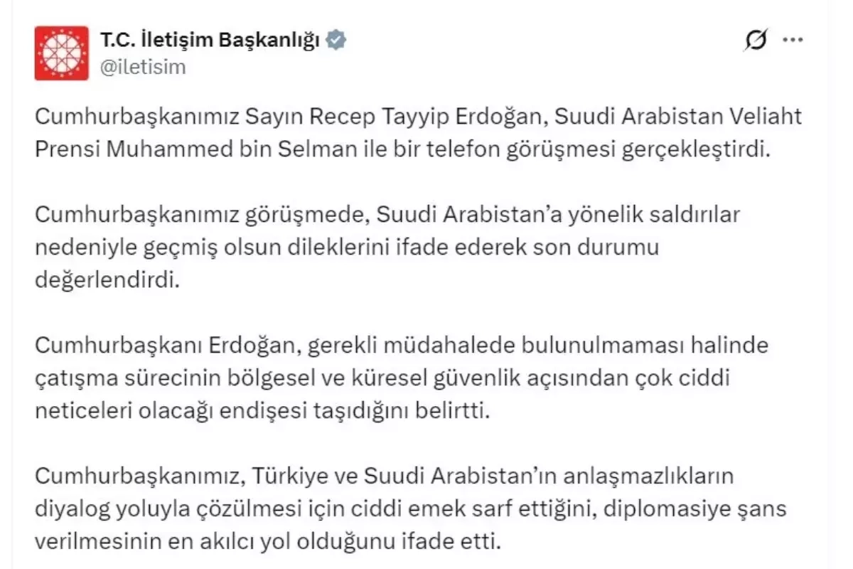 İletişim Başkanlığı'nın sanal medya hesabından yapılan açıklamada, "Cumhurbaşkanımız Sayın Recep Tayyip Erdoğan, Suudi Arabistan Veliaht Prensi Muhammed bin Selman ile bir telefon görüşmesi gerçekleştirdi. Cumhurbaşkanımız görüşmede, Suudi Arabistan'a yönelik saldırılar nedeniyle geçmiş olsun dileklerini ifade ederek son durumu değerlendirdi. Cumhurbaşkanı Erdoğan, gerekli müdahalede bulunulmaması halinde çatışma sürecinin bölgesel ve küresel güvenlik açısından çok ciddi neticeleri olacağı endişesi taşıdığını belirtti. Cumhurbaşkanımız, Türkiye ve Suudi Arabistan'ın anlaşmazlıkların diyalog yoluyla çözülmesi için ciddi emek sarf ettiğini, diplomasiye şans verilmesinin en akılcı yol olduğunu ifade etti" denildi.