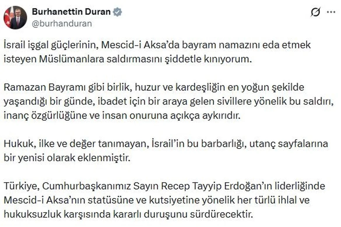 İletişim Başkanı Duran, sanal medya hesabından açıklama yaptı. Duran, "İsrail işgal güçlerinin, Mescid-i Aksa'da bayram namazını eda etmek isteyen Müslümanlara saldırmasını şiddetle kınıyorum. Ramazan Bayramı gibi birlik, huzur ve kardeşliğin en yoğun şekilde yaşandığı bir günde, ibadet için bir araya gelen sivillere yönelik bu saldırı, inanç özgürlüğüne ve insan onuruna açıkça aykırıdır. Hukuk, ilke ve değer tanımayan, İsrail'in bu barbarlığı, utanç sayfalarına bir yenisi olarak eklenmiştir. Türkiye, Cumhurbaşkanımız Sayın Recep Tayyip Erdoğan'ın liderliğinde Mescid-i Aksa'nın statüsüne ve kutsiyetine yönelik her türlü ihlal ve hukuksuzluk karşısında kararlı duruşunu sürdürecektir" dedi.