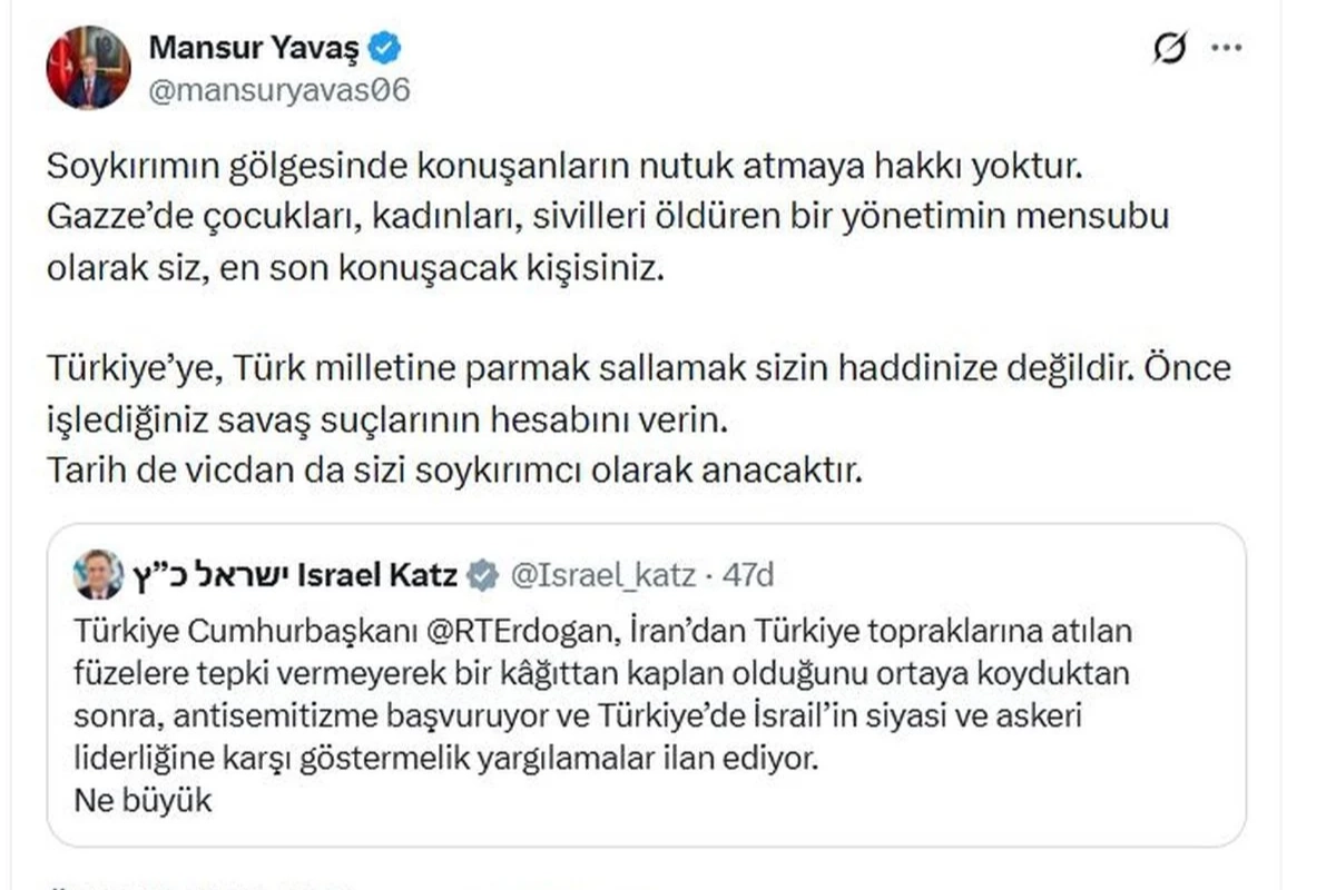 ANKARA Büyükşehir Belediye Başkanı (ABB) Mansur Yavaş, sanal medya üzerinden yaptığı paylaşımla Cumhurbaşkanı Recep Tayyip Erdoğan'ı hedef alan İsrail Savunma Bakanı Israel Katz'a yanıt verdi.