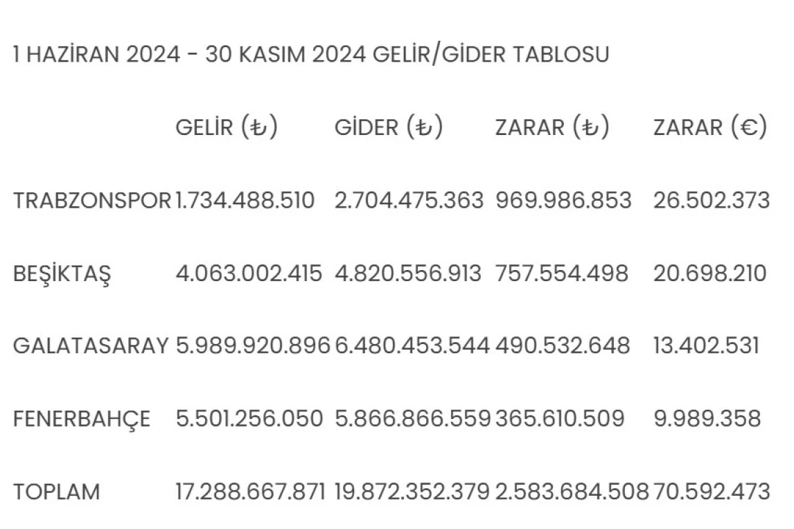 Fenerbahçe, Beşiktaş ve Galatasaray, 1 Haziran 2024 ile 30 Kasım 2024 arasındaki ilk aylık dönemde kar elde ettiklerini açıklasalar da bağımsız denetçi raporlarına göre dört kulüp de 1 Haziran 2024 ile 30 Kasım 2024 arasını zararla kapattı.