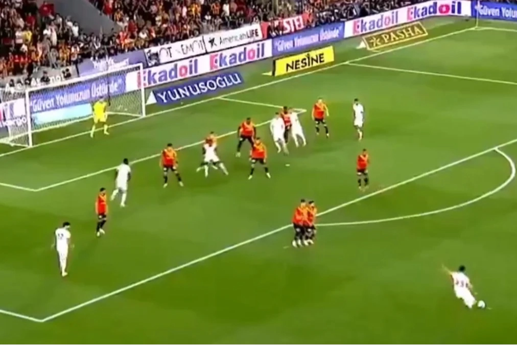 Sol iç kulvardan uzak mesafeden kullanılan serbest vuruşta Kaan Ayhan sağ ayağıyla vuruşunu yaptı, meşin yuvarlak uzak köşeden doksana gitti.