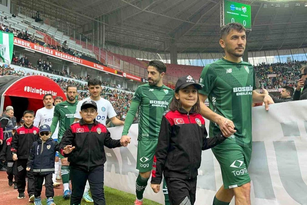 Eskişehir'de oynanan Ankara Demirspor-Bursaspor maçında Polis Haftası kapsamında üniforma ile sahaya çıkan minik taraftarlar ilgi odağı oldu.