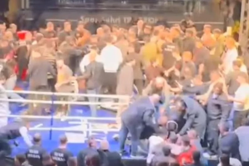 Görüntülerde; ringe plastik sandalyelerin fırlatıldığı, tekme ve yumruklarla birbirlerine giren kalabalığa görevlilerin güçlükle müdahale etmeye çalıştığı, salon hoparlörlerinden de sakin olunması yönünde anonslar yapıldığı anlar yer aldı.