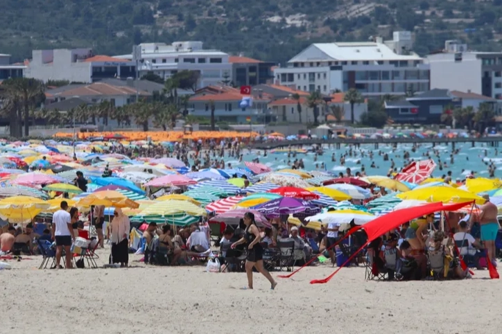 Nüfusu 1 milyonu aşan ilçede vatandaşlar denizin ve kumun tadını çıkartıyor. İlçenin en ünlü plajlarından Ilıca Plajı'nda yaşanan yoğunluk havadan görüntülendi. İzmir'in en ünlü ve gözde tatil noktalarından biri olan Çeşme'de bayram yoğunluğu yaşanıyor. İlçenin nüfusu bayramın ikinci günü itibariyle 1 milyonu aşarken, otellerde doluluk oranı ise yüzde 90'ı buldu. Çeşme'nin en ünlü plajlarından biri olan Ilıca Plajı'nda yaşanan yoğunluk göze çarptı. 3 kilometrelik şeridi olan ünlü plaja gelen vatandaşlar, kumsalları hıncahınç doldurdu. Bazı vatandaşlar yüzerek vakit geçirirken, bazıları da güneşlenmeyi tercih etti. Ilıca Plajı'nda oluşan kalabalık havadan görüntülendi.Öte yandan 4.5 günlük bayram tatili için İzmir Çeşme'ye gelen vatandaşlar, Alaçatı gişelerinde de metrelerce yoğunluk oluşturdu. İlçede hem polis hem de jandarma, ek tedbirlerle tatilcilerin rahat ve huzurlu bir bayram geçirmesi için önlem aldı.
