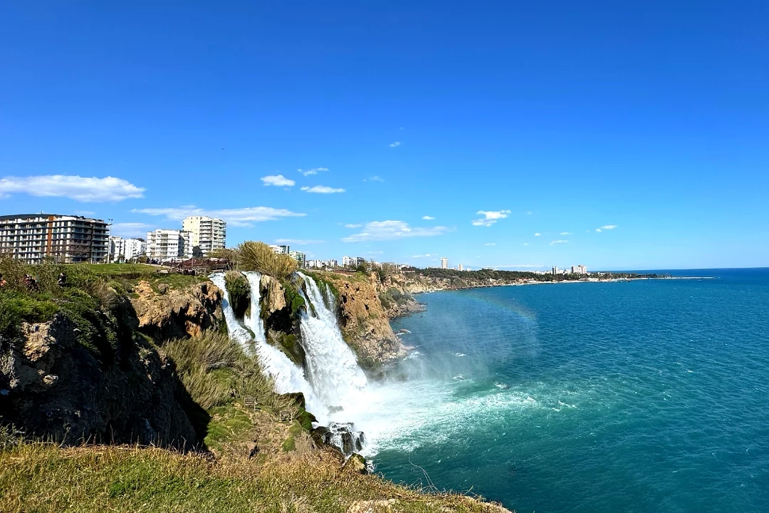 Lara bölgesinde bulunan Düden Şelalesi, her yıl olduğu gibi bu sene de yerli ve yabancı turistlerin yoğun ilgisini görüyor. Doğal güzellikleri ve eşsiz manzarasıyla ziyaretçilerini kendine çeken şelalede gökkuşağı oluştu. Düden Şelalesi'nin denizle buluştuğu noktaya gelen turistler, bu doğa harikasını ölümsüzleştirmek için birbirleriyle yarıştı. Gökkuşağı, ziyaretçilere unutulmaz anlar yaşattı.