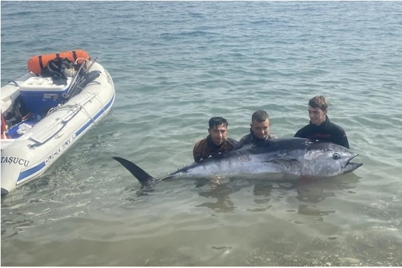 Yaklaşık 20 metre derinlikte bulunan büyük bir orkinos balığı dalış yapan gençlerin dikkatini çekti.