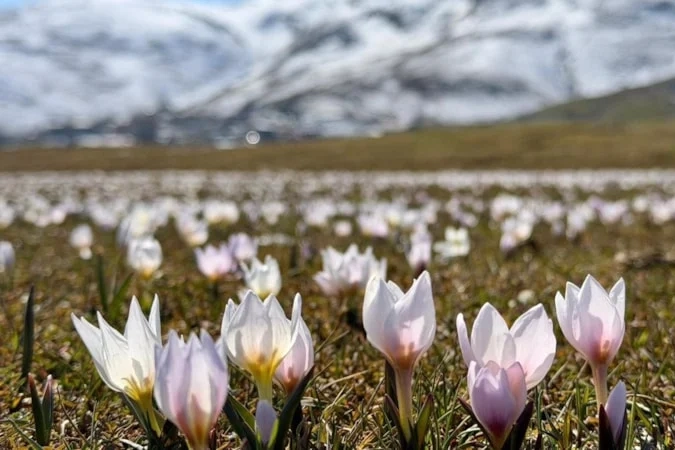 Yılın ilk çiçeklerinden ve baharın habercisi olarak bilinen çiğdemler, özellikle karla kaplı dağ eteklerinde yüzünü gösterdi. Beyaz örtünün arasından yükselen mor, sarı ve beyaz tonlardaki çiçekler, karlı zirvelerle bütünleşip güzel manzara sundu.