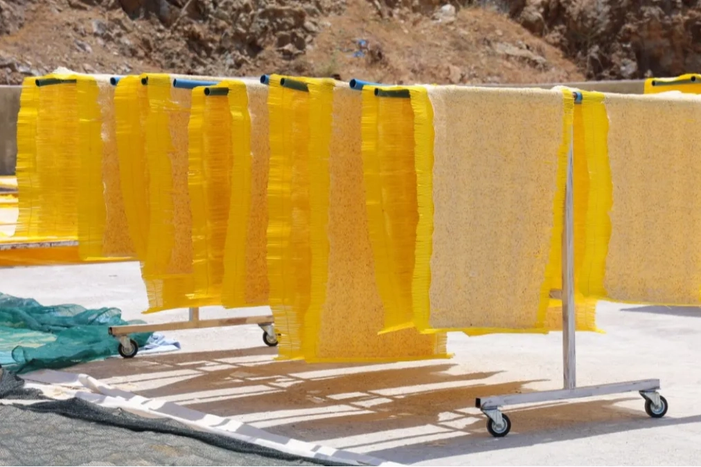 Geleneksel serme usulünün yerini alan makineli sistemle tarhana geniş kurutma alanlarına seriliyor ve güneşte kurutuluyor.