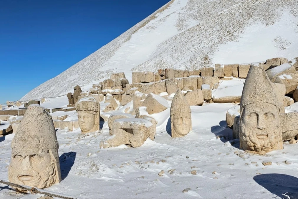 Güneşin doğuşunun ve batışının en güzel izlendiği yer olarak bilinen Adıyaman'daki 2 bin 206 metre rakımlı Kommagene Krallığı’na ait 50 metre yüksekliğinde, 150 metre çapındaki tümülüs ve dev heykellerin bulunduğu, yerli ve yabancı turistlerin akınına uğrayan Nemrut Dağı’nda kar yağışı ile birlikte yabancı turistler gelmeye başladı.