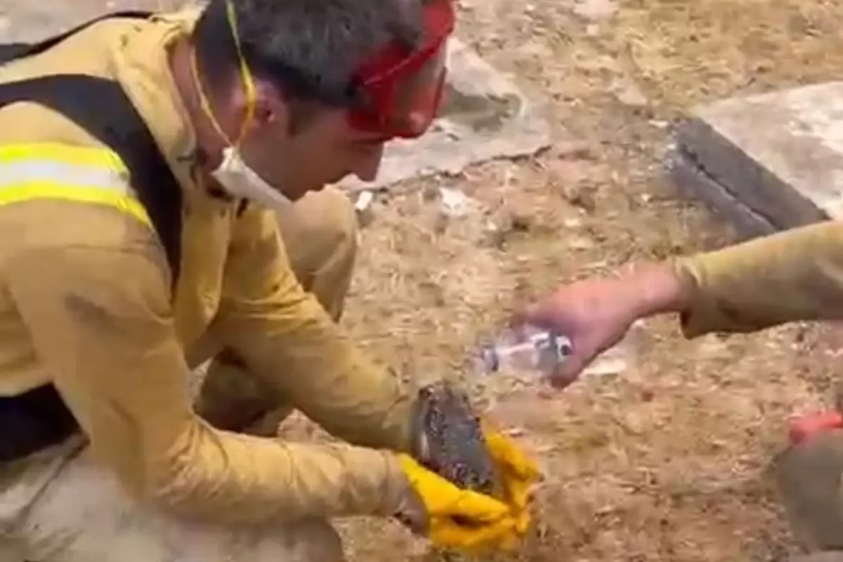 Çanakkale'nin Sarıcaeli köyünde çıkan yangına müdahale edilirken, orman işçileri yangından kurtardıkları bir kirpiye su içirdi.