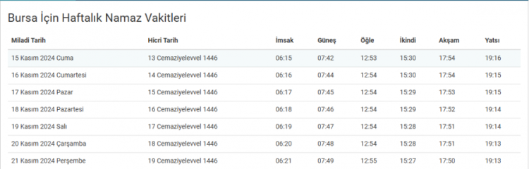 15 Kasım 2024 Bursa cuma saati kaçta?