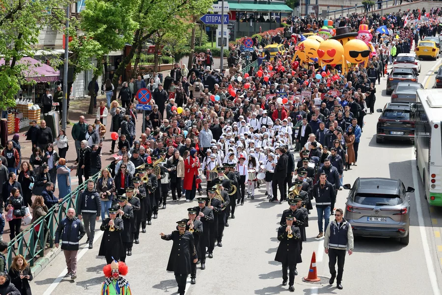 23 Nisan coşkusu, yüzlerce çocuk ve ailelerinin katılımıyla Çarşıbaşı'ndan Atatürk Stadyumu Kütüphanesi'ne doğru yapılan kortej yürüyüşüyle başladı. Ellerinde Türk bayraklarıyla marşlar ve şarkılar söyleyen çocuklara, Büyükşehir Belediyesi Başkan Vekili Şahin Biba, AK Parti Bursa İl Başkanı Davut Gürkan, AK Parti Bursa Milletvekili Mustafa Yavuz, Büyükşehir Belediyesi Genel Sekreteri Deniz Köken, meclis üyeleri, siyasi parti temsilcileri, sivil toplum kuruluşları üyeleri ve aileler de eşlik etti. Çocuklar, ellerindeki pankartlar, Türk ve Atatürk bayraklarıyla Atatürk Stadyumu Kütüphanesi'ne kadar bando eşliğinde coşkuyla yürüdü.