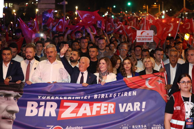 Yürüyüşe Bursa Büyükşehir Belediye Başkanı Mustafa Bozbey ve eşi Seden Bozbey’in yanı sıra CHP İl Başkanı Nihat Yeşiltaş, CHP Parti Meclis üyesi Canan Taşer, milletvekilleri, ilçe belediye başkanları, siyasi partilerin temsilcileri ve çok sayıda protokol üyesi de katıldı. Atatürk Caddesi’ni baştan sona dolduran on binlerce kişi, ellerindeki meşaleler, Türk bayrakları ve pankartlarla Kültürpark Atatürk Stadyumu Meydanı'na kadar marşlar eşliğinde yürüdü. Ellerindeki meşale ve pankartlarla omuz omuza yürüyen Bursalılar, hafızalara kazınacak bir manzaraya imza attı.