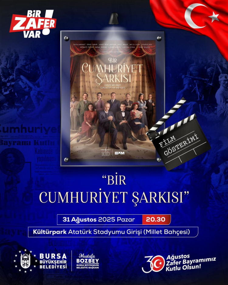 Nâzım Hikmet’in Kuvâyi Milliye Destanı’nın okunacağı Millet Bahçesi’nde, sevilen sanatçı Göksel’in sahne almasıyla coşku doruğa çıkacak. 31 Ağustos Pazar günü ise saat 20.30’da Kültürpark Atatürk Stadyumu girişinde ‘Bir Cumhuriyet Şarkısı’ film gösterimi yapılacak.