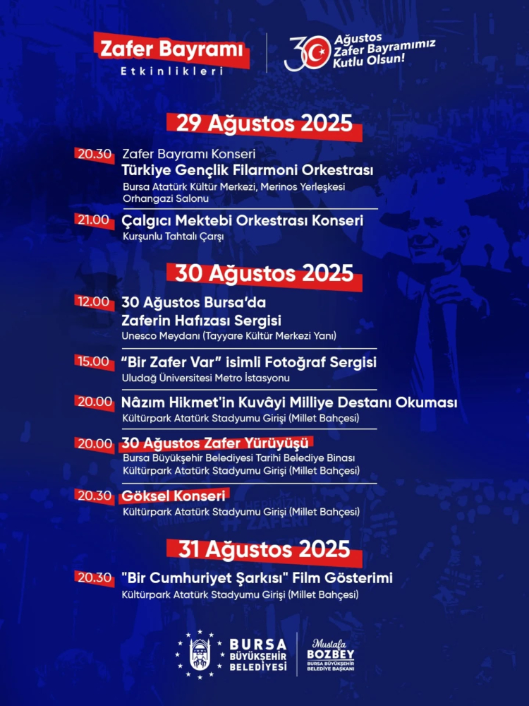 30 Ağustos Cumartesi günü ise saat 12.00’de UNESCO Meydanı’nda ’30 Ağustos Bursa’da Zaferin Hafızası’ segisi, saat 15.00’de Uludağ Üniversitesi Metro İstasyonu’nda ‘Bir Zafer Var’ fotoğraf sergisi izlenime sunulacak. ’30 Ağustos Zafer Yürüyüşü’ ise saat 20.00’de Bursa Büyükşehir Belediyesi Tarihi Belediye Binası önünden başlayarak Kültürpark Atatürk Stadyumu girişine (Millet Bahçesi) kadar sürecek.