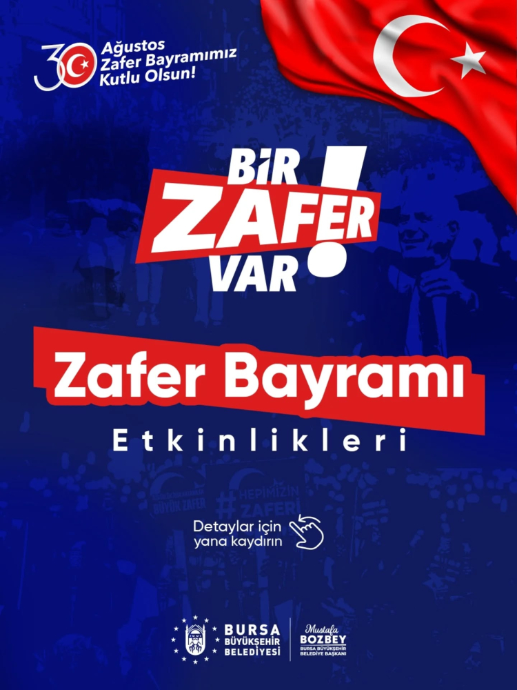 Bursa'da 30 Ağustos Zafer Bayramı, Büyükşehir Belediyesi'nin "Bir Zafer Var" temasıyla düzenleyeceği birbirinden zengin etkinliklerle büyük bir coşkuyla kutlanacak. Konserlerden sergilere, Zafer Yürüyüşü’nden film gösterimine kadar birçok programla üç gün sürecek olan kutlamalarda coşku, ‘Göksel’ konseri ile zirve yapacak.