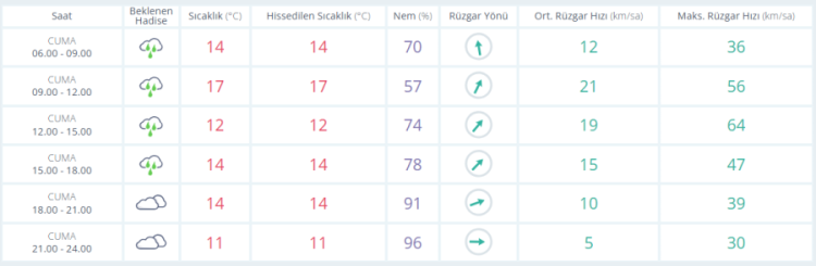 Yağış devam ediyor. Günün en serin saatleri yaşanacak, sıcaklık 12-14°C. Nem oranı yüksek. Rüzgâr yer yer sert, 64 km/sa'ye kadar çıkabiliyor.