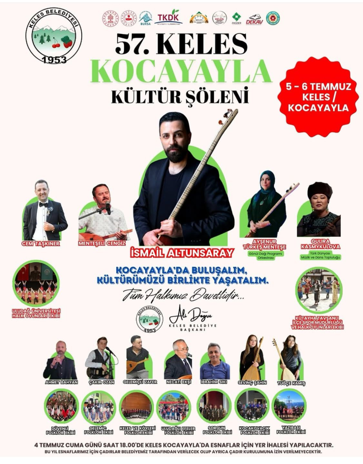 “57. Keles Kocayayla Kültür Şöleni’ne destek veren Kültür ve Turizm Bakanlığımıza, Keles Kaymakamlığına, İlçe Milli Eğitim Müdürlüğümüze, Bursa Kültür ve Turizm Tanıtma Birliğimize dolayısıyla Oktay Yılmaz başkana, sponsorlarımıza, sanatçılarımıza, muhtarlarımıza, dernek başkanlarımıza, ve katılımlarıyla bizi onurlandıracak hemşehrilerimize ve kıymetli misafirlerimize en içten teşekkürlerimizi sunuyor; tüm halkımızı Kocayayla’nın eşsiz doğasında buluşmaya, köklerimizle yeniden bağ kurmaya davet ediyorum.”