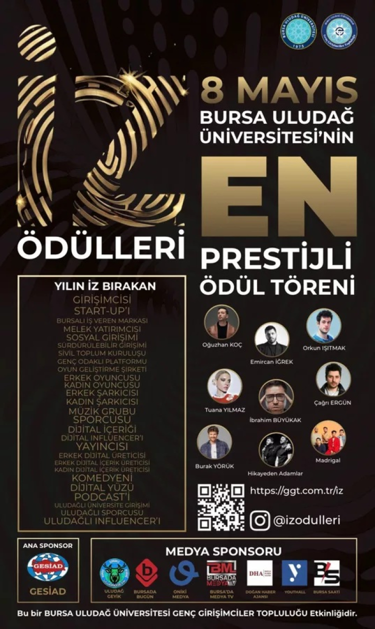 Bursa Uludağ Üniversitesi Genç Girişimciler Topluluğu'nun düzenlediği "İZ Ödülleri", 8 Mayıs'ta gerçekleştirilecek prestijli törenle yılın iz bırakan isimlerini ödüllendirecek.