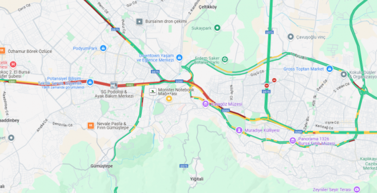 Harita görünümünde Bursa trafiği, İzmir istikametinde tamamen 'kırmızı' olarak gözükürken, Ankara istikametinde 'sarı' olarak göründü.