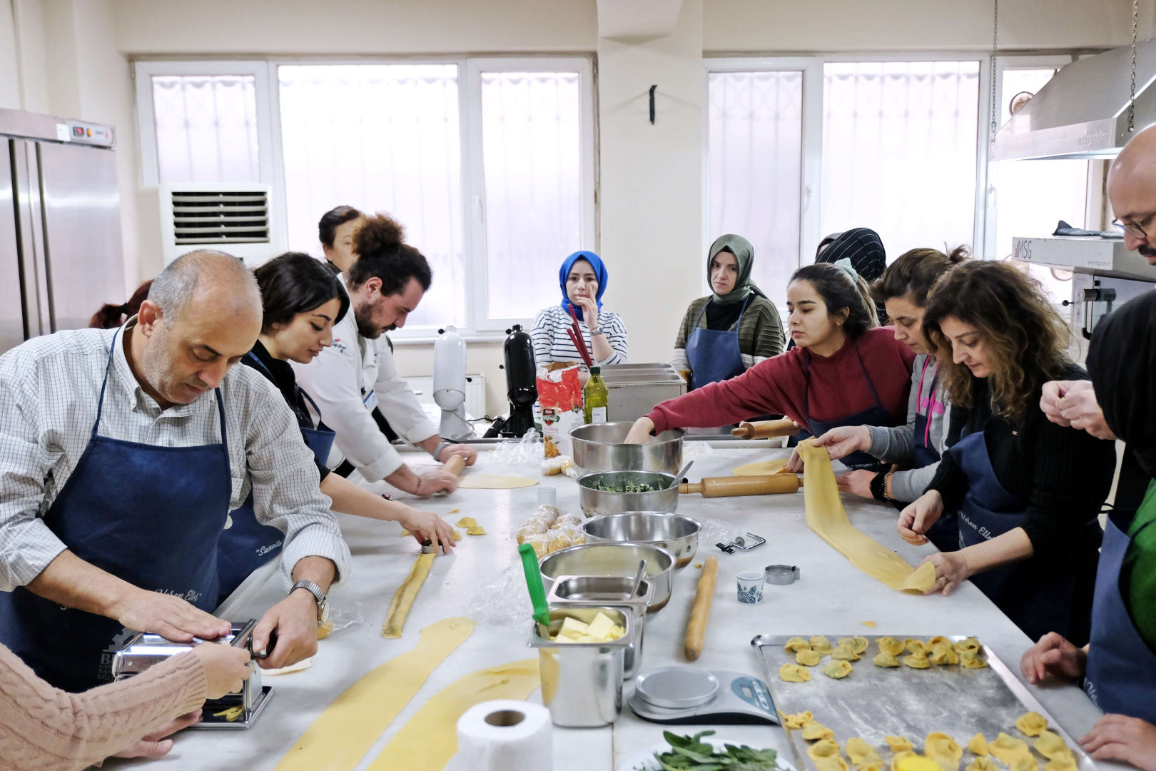 Yeni Karaman Mesleki Eğitim Merkezinde üç gün boyunca “Pratik Pizza Yapımı”, “Makarna ve Sosları Yapımı” ile “Çikolata Yapımı” atölye çalışmaları düzenlendi. Katılımcılar, profesyonel mutfakta, yiyecek içecek alanı öğretmenleri tarafından yönlendirilirken, pizza hamurunun nasıl hazırlandığını, nasıl şekillendirildiğini ve nasıl pişirildiğini uygulamalı olarak öğrendiler. Benzer şekilde, katılımcılar Fettuccine ve Ravioli gibi farklı makarna çeşitlerinin nasıl yapıldığını öğrendiler. Ayrıca çikolatayı temperleme işlemini, Beyoğlu ve Rocher gibi farklı çikolataların nasıl yapıldığını bizzat deneyimleyerek gördüler.