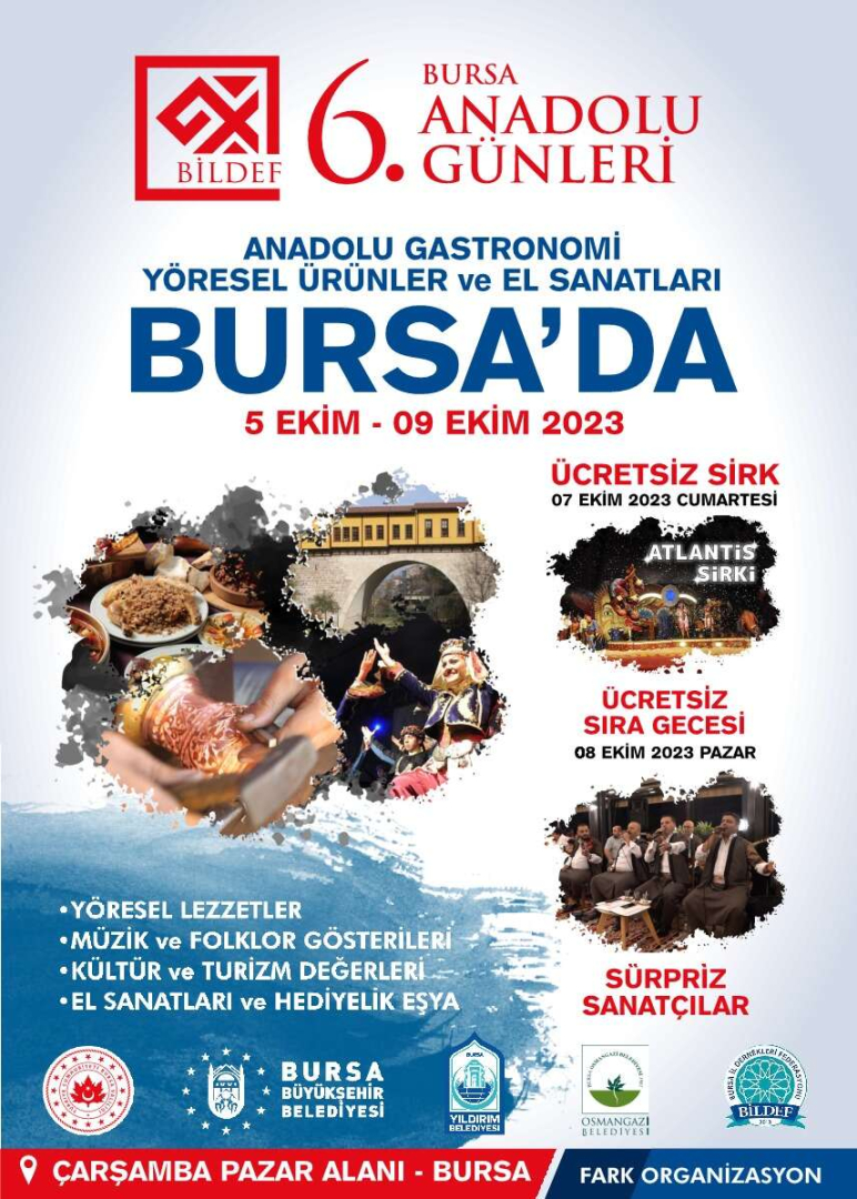 Etkinliğimizde; yöresel ürünler, el sanatları, gastronomi, müzik ve folklor ağırlıklı olacak. Ayrıca 7 Ekim Cumartesi günü etkinlik alanımızda Atlantis Sirki, 8 Ekim Pazar günü Sıra Gecesi, folklor gösterileri ve sürpriz sanatçılar halkımıza ücretsiz olarak gösteri sunacaktır. Bursalı hemşehrilerimizi kültürlerin buluşacağı Anadolu Günleri etkinliğimize bekliyoruz” diye konuştu.