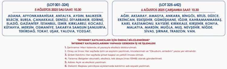 Satışa çıkan arsalar Bursa'dan İstanbul'a, Ankara'dan Sivas'a kadar 56 ayrı ilde bulunuyor. Müzayede tarihleri şöyle:
