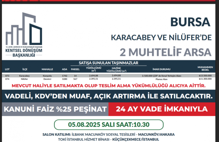 T.C. Çevre, Şehircilik ve İklim Değişikliği Bakanlığı Kentsel Dönüşüm Başkanlığı Tarafından 5-6 Ağustos'ta Bursa dahil 56 ilde 642 arsa müzayedesi düzenleyecek. Peki, ödeme koşulları nasıl? İşte detaylar: