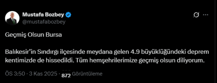 "Geçmiş olsun Bursa. Balıkesir'in Sındırgı ilçesinde meydana gelen 4.9 büyüklüğündeki deprem kentimizde de hissedildi. Tüm hemşehrilerimize geçmiş olsun diliyorum." ifadelerini kullandı.