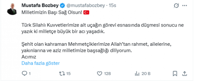 Acı haber ailelere bildirilirken askerlerin acısı Türkiye gündemine bomba gibi düştü. 20 askerimizin şehit düştüğü kaza için Mustafa Bozbey, taziye mesajında;