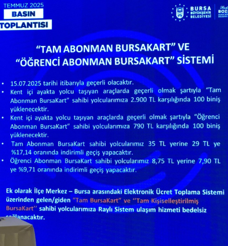 Bursa Büyükşehir Belediye Başkanı Mustafa Bozbey, gerçekleştirilen Temmuz 2025 değerlendirme toplantısında yeni ulaşım kartı sisteminin müjdesini verdi. Başkan Bozbey, "Artık abonman yerine Kişiselleştirilmiş BursaKart Abonman Sistemi'ne geçiyoruz. Kullanıcılarımıza çeşitli avantajlar sunacak raylı sistem kullanımına teşvik edeceğiz" dedi.