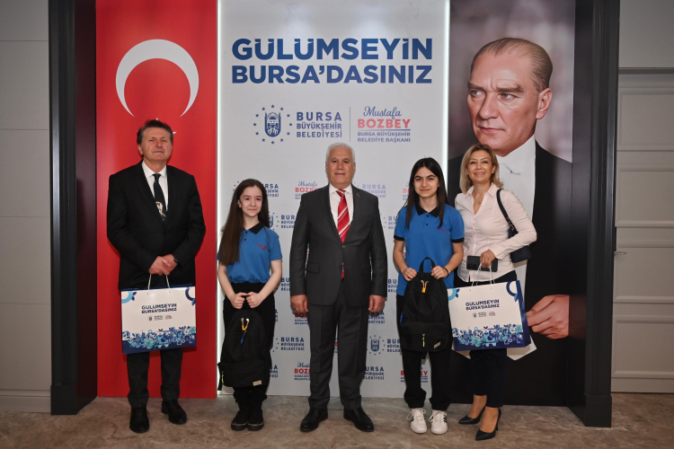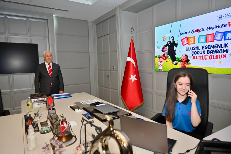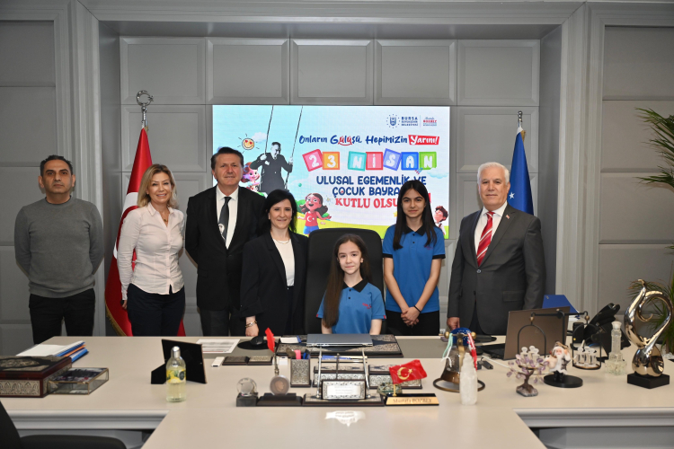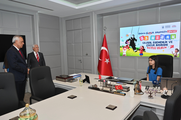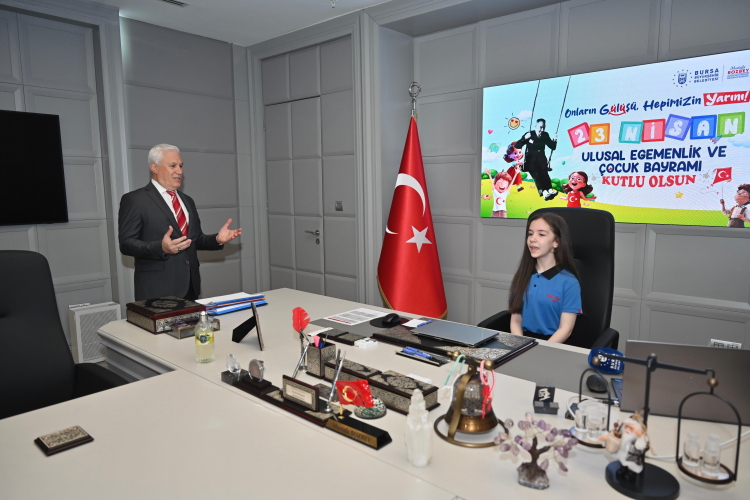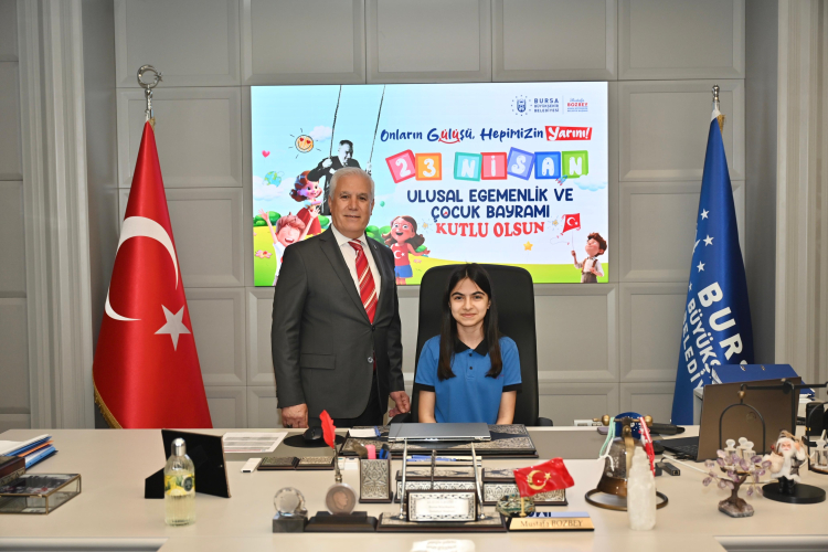 Bursa Büyükşehir Belediye Başkanı Mustafa Bozbey, 23 Nisan Ulusal Egemenlik ve Çocuk Bayramı dolayısıyla koltuğunu temsili olarak 7. sınıf öğrencileri Duru Tuna ve İlke Ormancı’ya devretti.