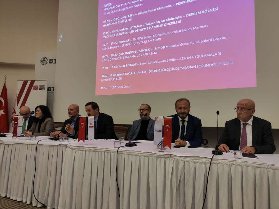 BTSO tarafından İnşaat Sektöründe Deprem Bilinci Paneli gerçekleştirildi. Yüksek İnşaat Mühendisi Ünsal Eser, Yüksek İnşaat Mühendisi Mehmet Atmaca, Jeoloji Mühendisleri Odası Güney Marmara Şubesi Başkanı Engin Er, TMMOB Mimarlar Odası Bursa Şubesi Başkanı Şirin Rodoplu, Beton Laboratuvarı Sahibi Yaşar Poyraz ve Avukat Bülent Yaylalı'nın konuşmacı olarak katıldığı panel, BTSO Yönetim Kurulu Üyesi Alparslan Şenocak'ın açılış konuşmasıyla başladı.