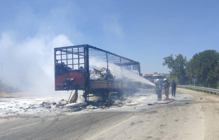 Bursa-Balıkesir yolu üzeri Karacabey ilçesinde meydana gelen olayda, karton yüklü tır çıkan yangın sonucu alev topuna döndü.