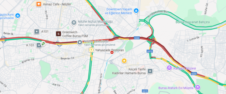 Trafik yoğunluğunu gösteren harita verilerinde, Bursa'nın en çok kullanılan bu yolunun 'koyu kırmızı' renkle işaretlendiği görüldü.