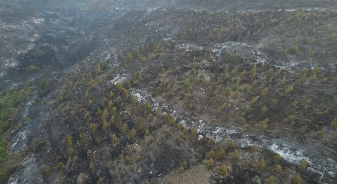 Bursa'nın Büyükorhan ilçesinde ormanlık alanda çıkan yangın günün ilk ışıklarında dron ile havadan görüntülendi.