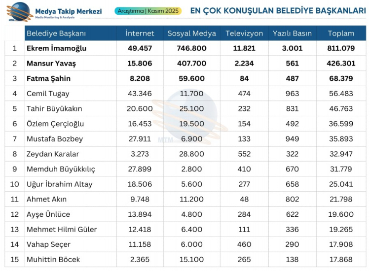 MTM Medya Takip Merkezi, Kasım 2025'te medya ve sosyal medya mecralarında en çok konuşulan Büyükşehir Belediye Başkanlarını araştırdı. Ay boyunca en yüksek görünürlüğe ulaşan isimler Ekrem İmamoğlu, Mansur Yavaş ve Fatma Şahin oldu. Bursa Büyükşehir Belediye Başkanı Mustafa Bozbey ise medyada en çok konuşulan 3'üncü, sosyal mecralarda en çok konuşulan 12'nci isim oldu.
