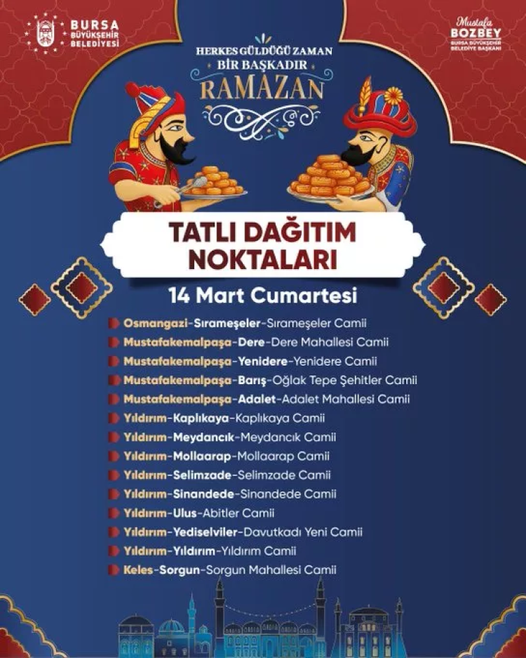 Bursa Büyükşehir Belediyesi, Ramazan ayının birlik ve paylaşma ruhunu yaşatmak amacıyla kent genelinde çeşitli etkinlikler düzenlemeye devam ediyor. Bu kapsamda 14 Mart Cumartesi günü Bursa'nın farklı ilçelerinde belirlenen teravih sonrası cami önlerinde vatandaşlara tatlı dağıtımı yapılacak.