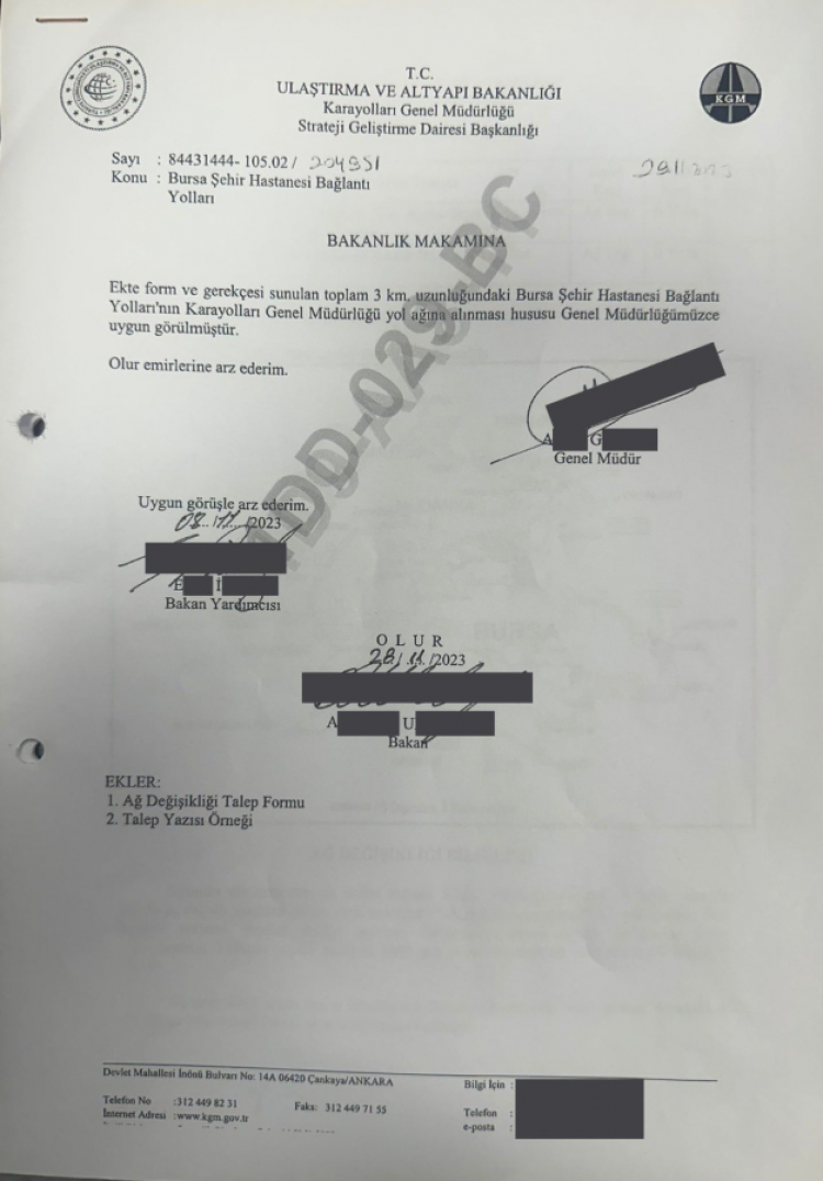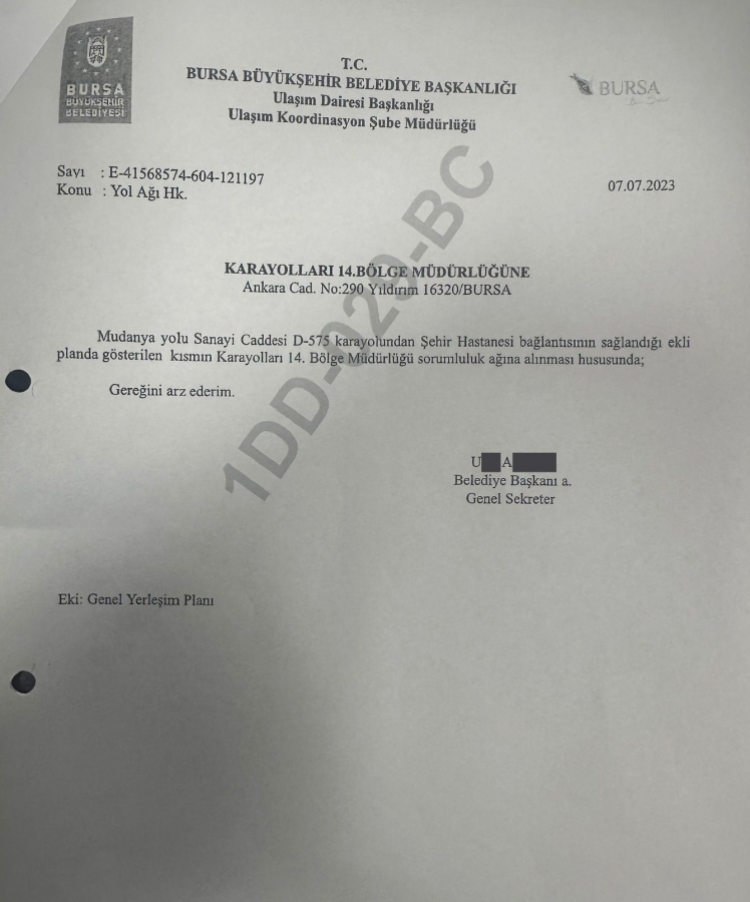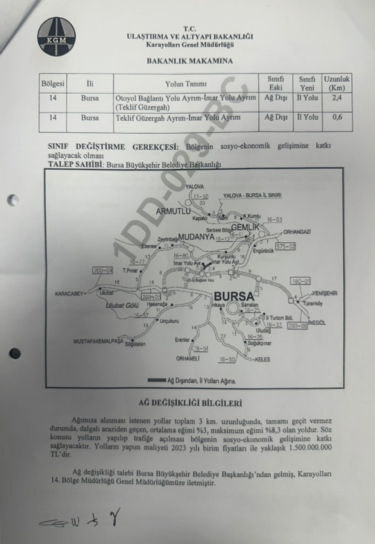 07.07.2023 tarihli ve 121197 sayılı yazı ile, dönemin Belediye Başkanı tarafından yolun Karayolları ağına alınması resmi olarak talep edilmiştir.