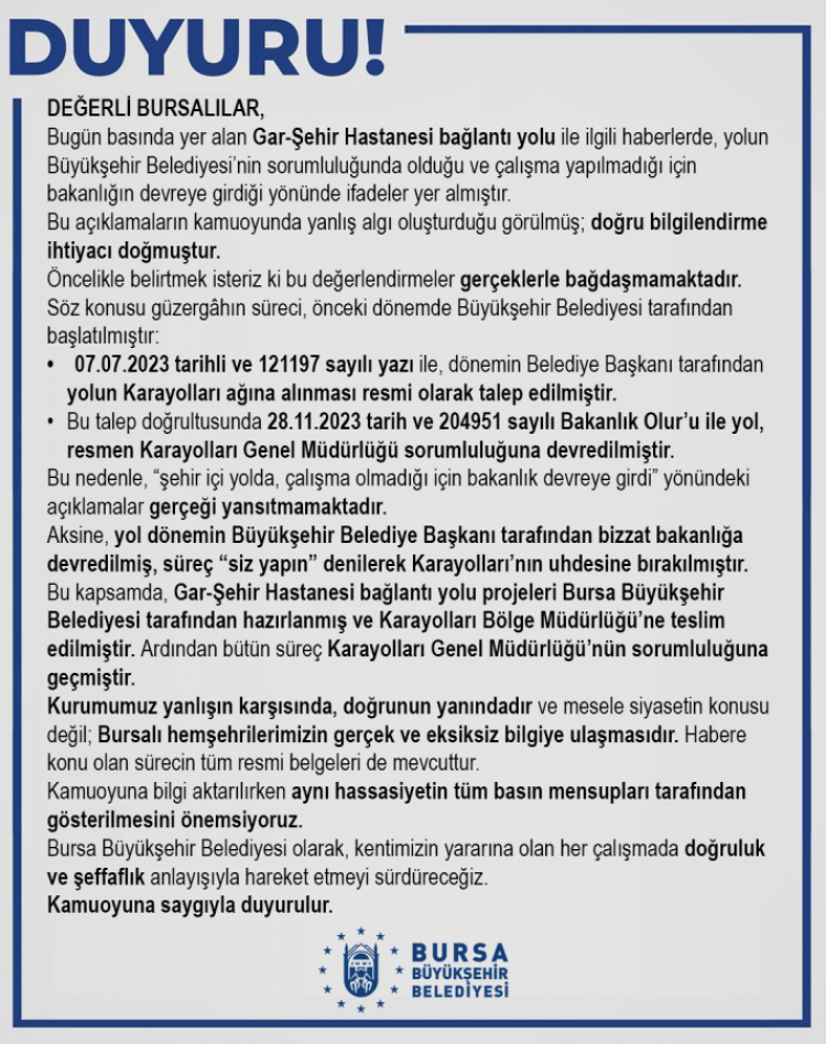 Bursa Büyükşehir Belediyesi Gar-Şehir Hastanesi bağlantı yolu ile ilgili yol çalışmalarının Büyükşehir Belediyesi'nin sorumluluğunda olduğu ve çalışma yapılmadığı için bakanlığın devreye girdiği yönünde çıkan iddialara yanıt verdi.