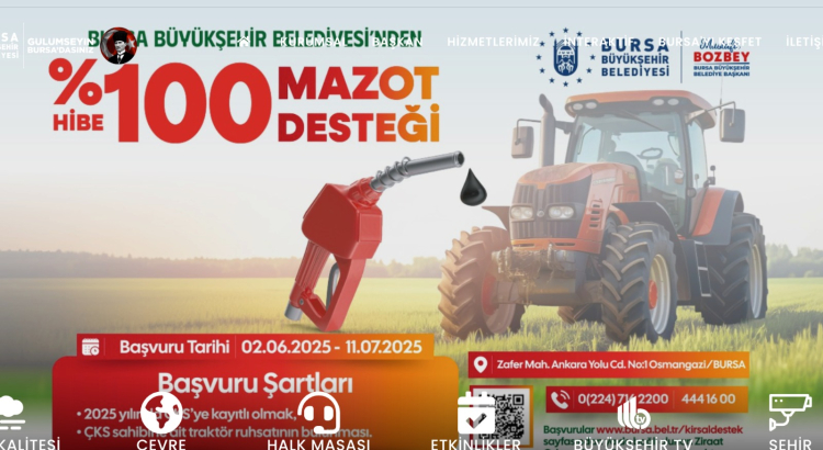 Bursa Büyükşehir Belediyesi, üreticilerin desteklenmesi ve girdi maliyetlerinin azaltılması amacıyla yüzde 100 hibe ‘Mazot Desteği’ Projesi’ni hayata geçirdi. Başvurular, 11 Temmuz 2025 tarihine kadar www.bursa.bel.tr/kirsaldestek sayfasından ya da bağlı olunan ziraat odasından online olarak yapılabilecek.