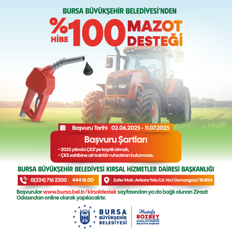 Başvurular, 11 Temmuz 2025 tarihine kadar www.bursa.bel.tr/kirsaldestek sayfasından ya da bağlı olunan ziraat odasından online olarak yapılacak.