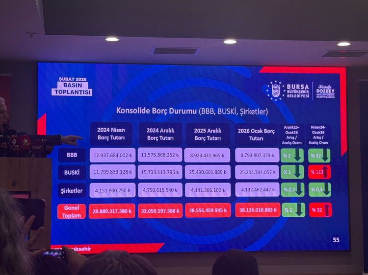 Bursa Büyükşehir Belediye Başkanı Mustafa Bozbey, Şubat ayı basın toplantısında belediye, BUSKİ ve iştirak şirketlerini kapsayan güncel borç tablosunu kamuoyuyla paylaştı. Açıklanan verilere göre toplam konsolide borç 38 milyar lirayı geçti.