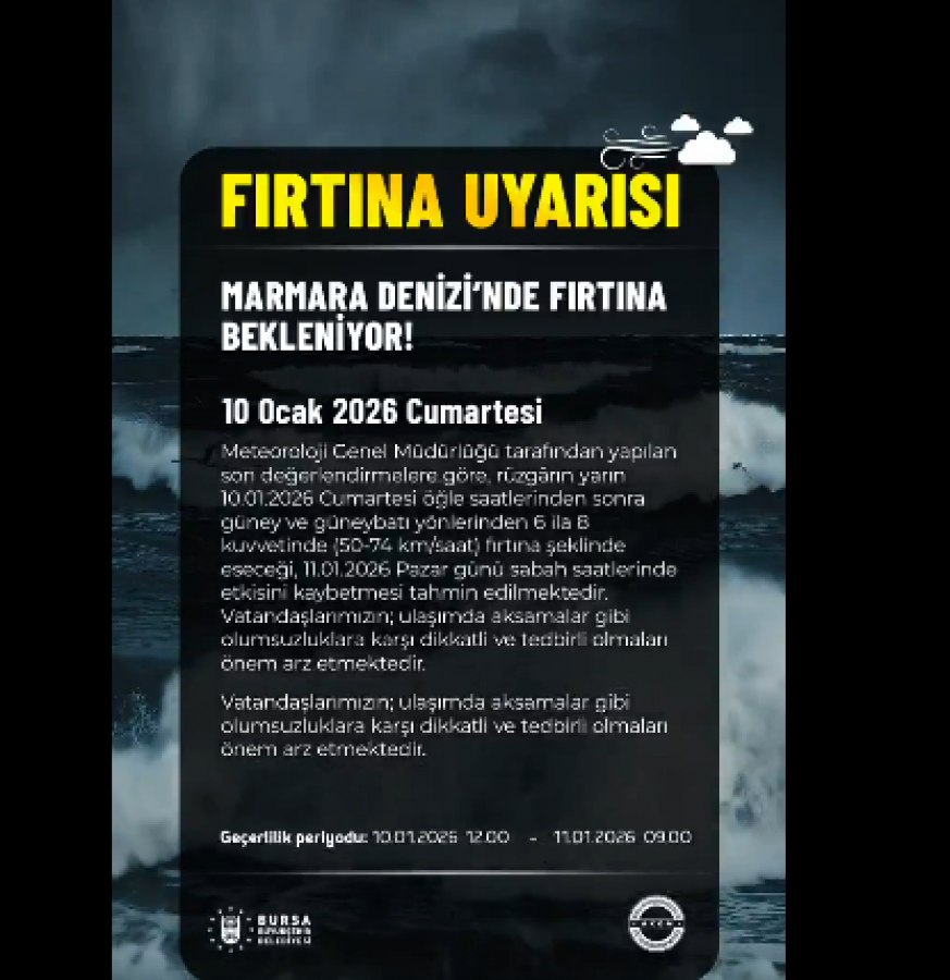 Meteoroloji Genel Müdürlüğü, Marmara Denizi için fırtına uyarısında bulundu. Yapılan değerlendirmelere göre, 10 Ocak 2026 Cumartesi günü öğle saatlerinden itibaren rüzgârın kuzey ve kuzeydoğu yönlerden 6 ila 8 kuvvetinde (50-74 km/s) fırtına şeklinde eseceği tahmin ediliyor.