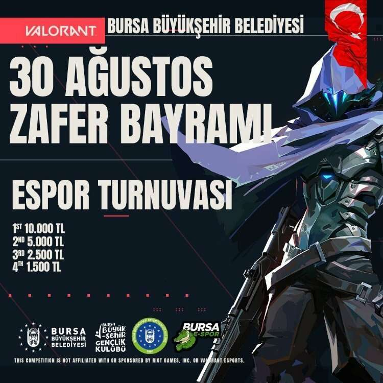 Bursa Büyükşehir Belediyesi, 30 Ağustos Zafer Bayramı'na özel Valorant Turnuvası düzenliyor. Turnuvayı ilk sırada bitiren takıma 10 bin TL ödül verilecek. İşte diğer kazananların alacağı ödül miktarları...