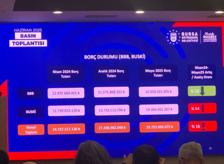 Bursa Büyükşehir Belediyesi'nin Mayıs 2025 güncel borcunun yüzde 20 azalışla birlikte 10 milyar 359 milyon 431 bin 405 TL olduğu belirtildi. BUSKİ'nin ise güncel borcunun Mayıs 2025'te yüzde 64 oranında arttığı belirtilerek 19 milyar 364 milyon 561 bin 267 TL olduğu Başkan Bozbey tarafından açıklandı.