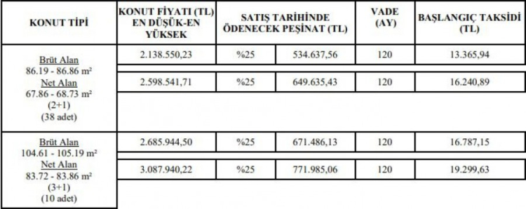 Satışa Sunulan Konut Sayısı: 2+1 konut 38 adet, 3+1 konut 10 adet