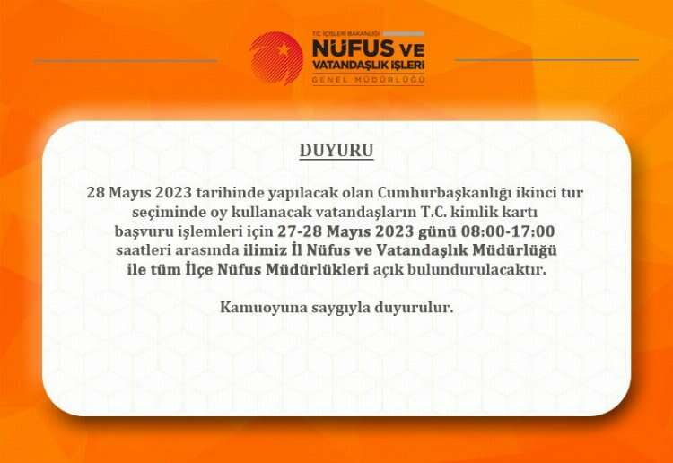 Oy kullanacakların kimlik kartı talebi için nüfus müdürlükleri 27-28 Mayıs'ta açık olacak.